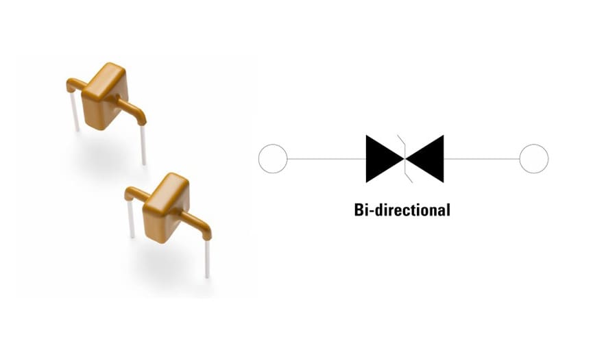 A special component that can capture the transient voltage components that have passed through the MOV and discharge tube is the transient voltage suppressor (TVS) diode. TVS diodes have lower clamping voltages, and operate much faster than MOV devices. Special diodes can ensure the protection of the downstream circuit. They can absorb a pulse of one kA and respond in less than one nanosecond. TVS diodes can provide protection against electrostatic discharge (ESD) in air up to 15 kV and direct discharge up to 8 kV. Bi-directional models and models less than one-tenth the size of traditional differential solutions are available. A TVS diode can have an axial lead or a surface mount form factor. Figure 5 shows a TVS diode and its functional diagram, using i AK1-Y Series TVS Diode from Littelfuse for example. This component will provide the necessary protection from both ESD and other transients to avoid damage to the semiconductor circuitry in the wireless charger.