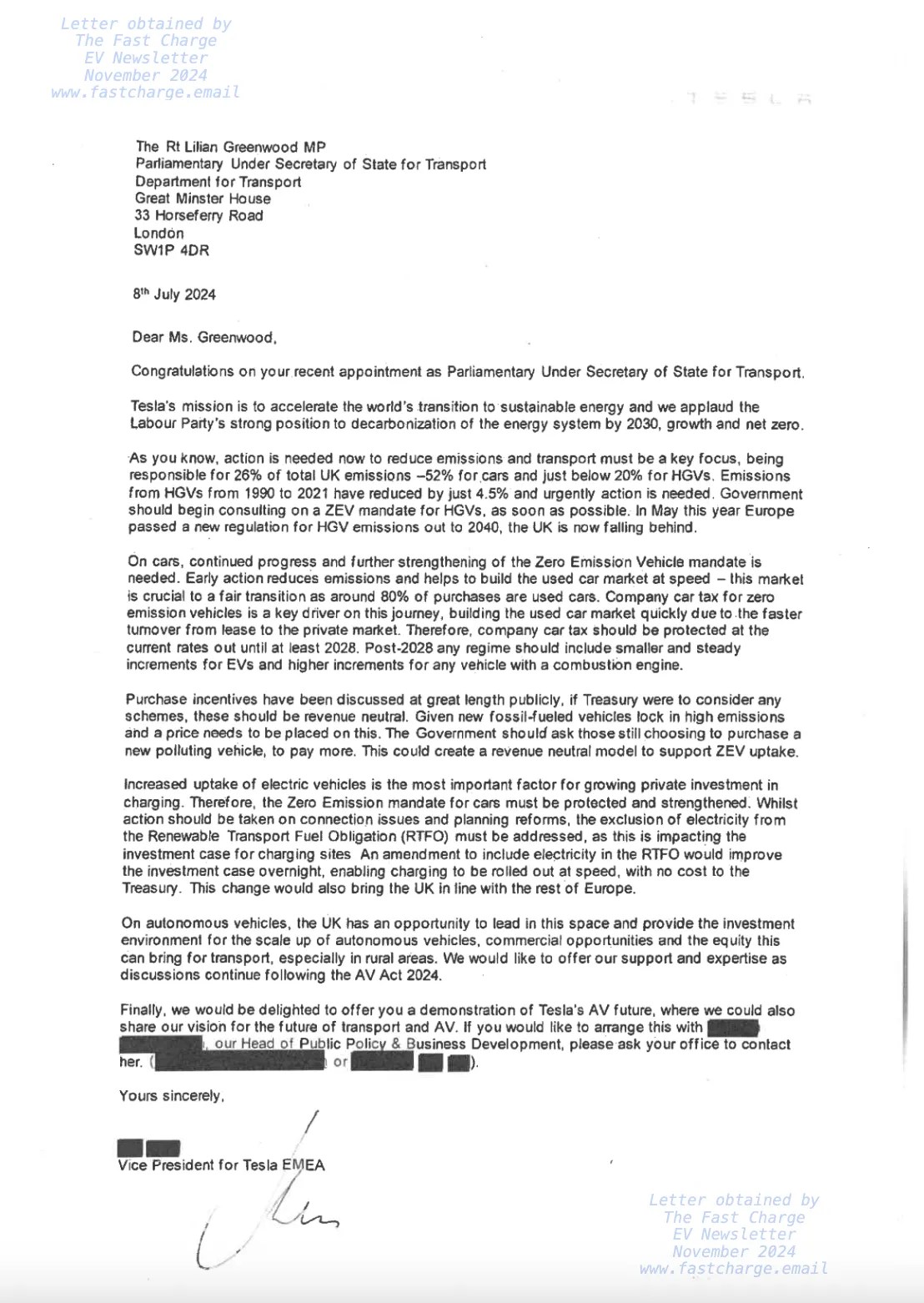 In a letter to the new transport minister, Tesla's head of Europe, Joe Ward, acknowledges the UK's need to reduce its emissions and how important electric vehicles are to achieving this goal.