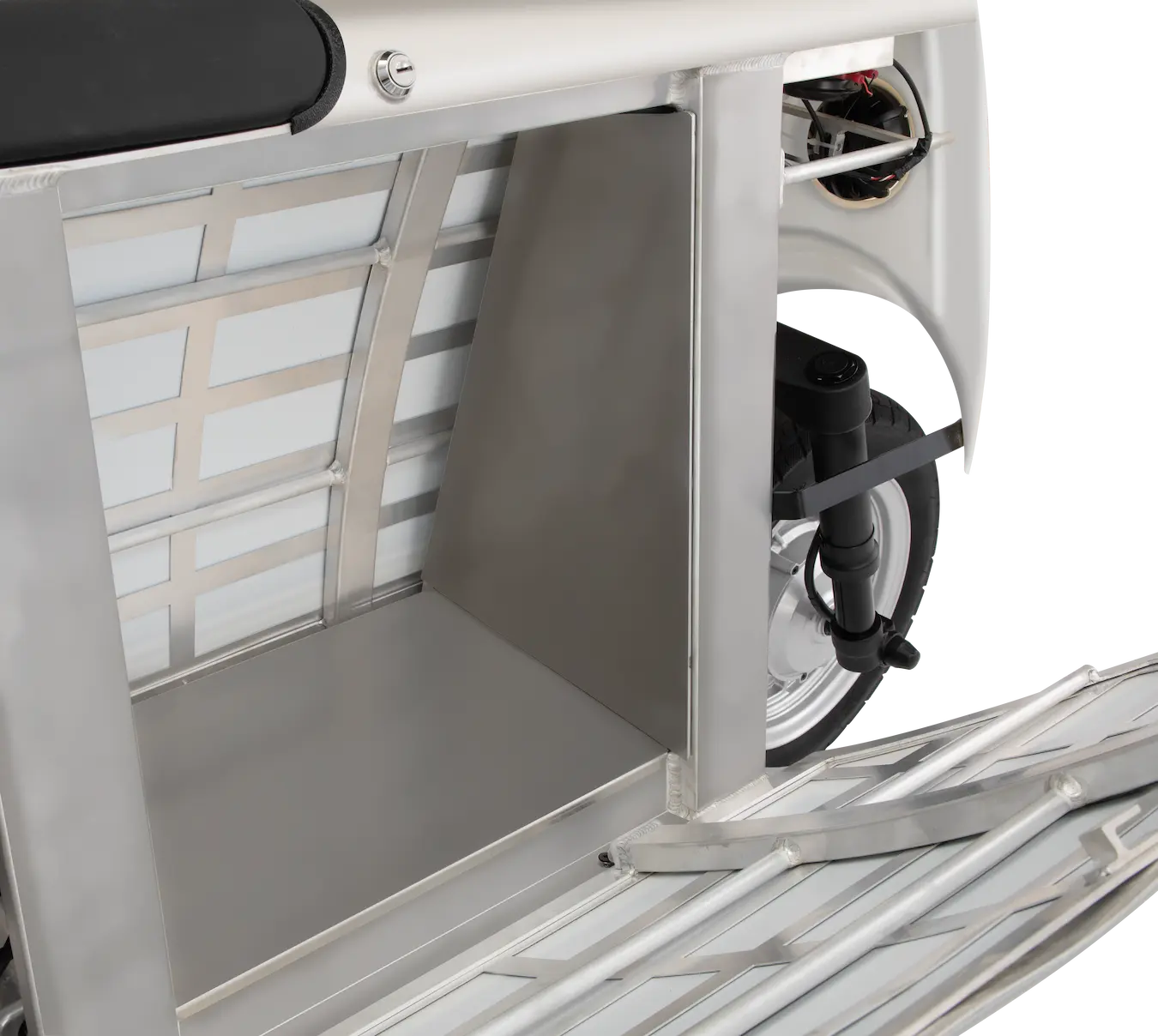 Developed by Otherlab, the Lightfoot electric scooter features 120W solar panels on both sides, hiding a 45.2 L (12-gallon) storage space. One panel is hinged, opening the entire side of the vehicle for easy access to luggage, then locks into place to keep it secure.