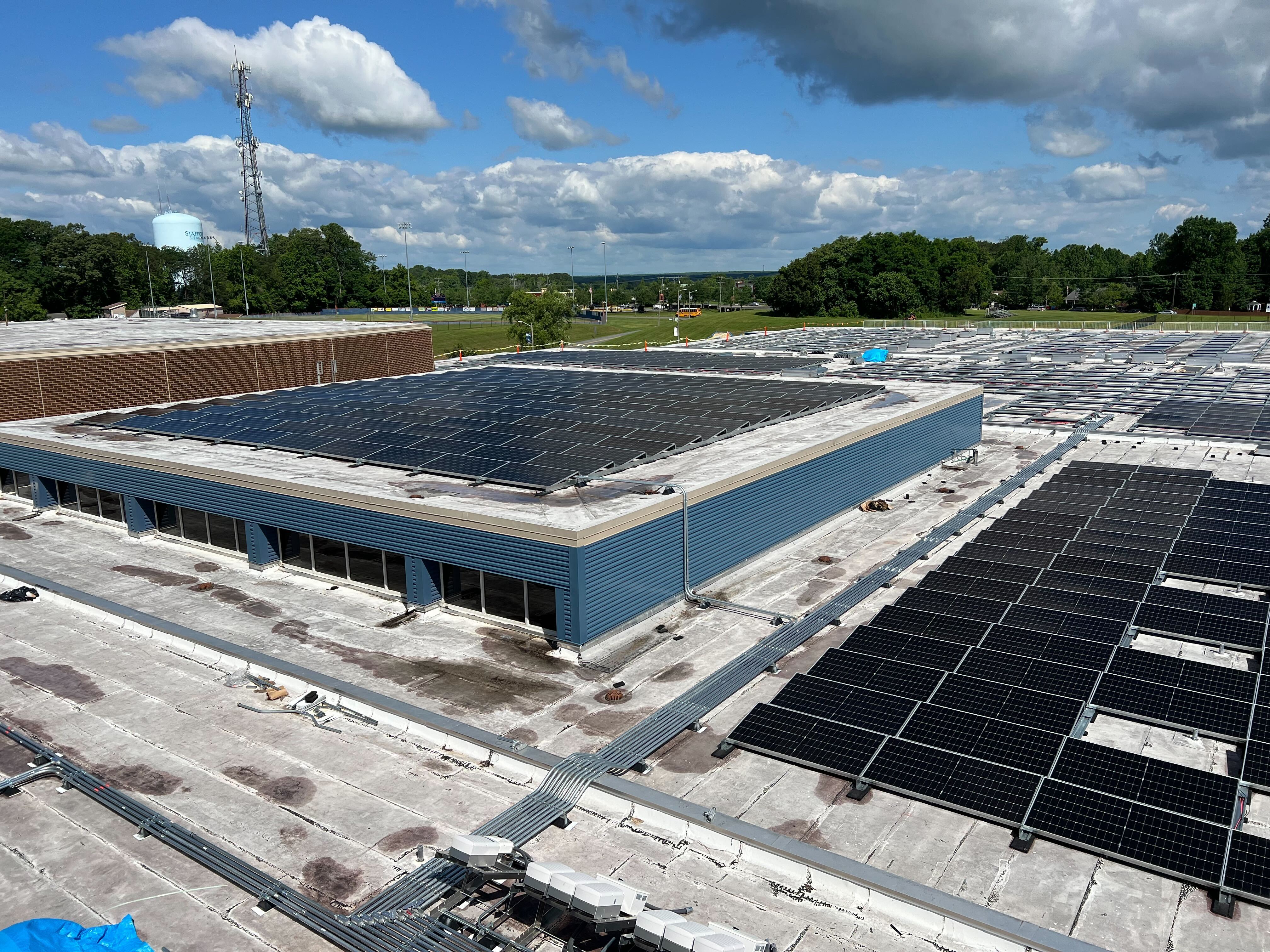 Stafford County Public Schools has partnered with Madison Energy Infrastructure (MEI) of New York to install rooftop solar at North Stafford High School. It is made up of 3,300 solar panels, and will save the school system an estimated $2.8 million in electricity bills over the next 25 years. The roof will also generate 54 million kilowatt hours of clean energy and remove 41,583 tons of CO2.